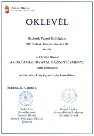 A Szolnok Városi Tehetséggondozó Szakkollégium ismételten megpályázta és szakmai munkája alapján megkapta az Oktatási Hivatal Bázisintézménye cím viselésének jogát. Ezzel ismerte el és értékelte az Oktatási Hivatal azt a színvonalas kollégiumpedagógiai tevékenységet, melyet pedagógusaink végeznek. A bíráló bizottság szakmai tapasztalataink alapján alkalmasnak ítélte intézményünket magas színvonalú, széles körben érdeklődésre számot tartó tudásmegosztásra, bevált jó gyakorlataink közzétételére.
